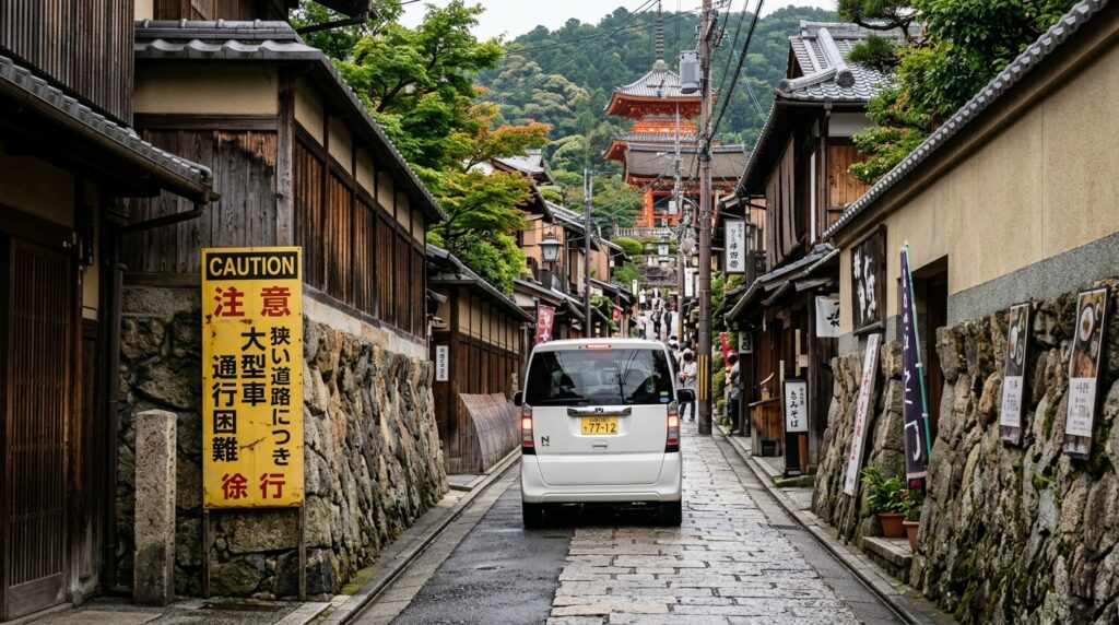 インバウンド団体客を乗せた大型バスが通るルートは、普通車にとって離合(すれ違い)が非常に困難です。大型バス専用駐車場(ローソン裏・バス17台収容)へ向かうルートと動線が重なる道は、特に午前中~昼過ぎに避けるのが賢明です。
