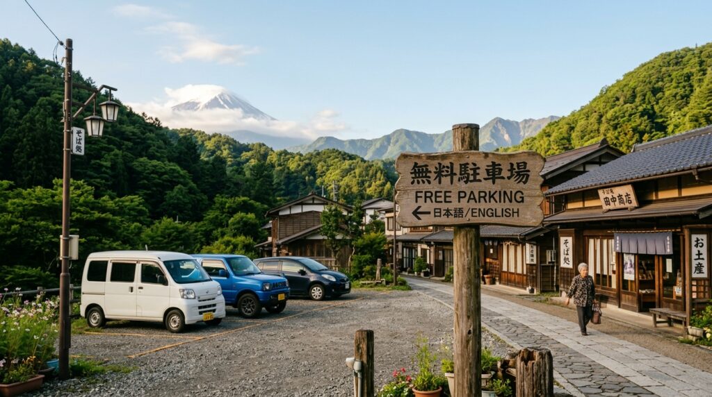 - 村営無料駐車場は廃止済みだが、池本駐車場(無料・約60台)や買い物条件付き無料の忍野屋やひのでやがある