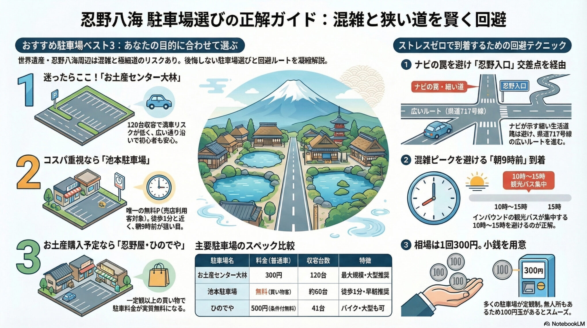 忍野八海の駐車場を探す前に、知っておくべき基本ルールが3つあります。これを押さえておくだけで、現地での「こんなはずじゃなかった」を防げます。