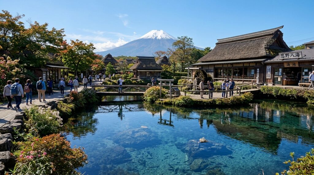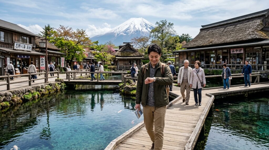 特に注意したいのが観光バスの存在です。忍野八海は団体ツアーの定番コースに組み込まれており、午前中から大型バスが次々と到着します。推奨時間は朝9時前、または夕方16時以降。特に早朝は富士山の透明度も高く、写真撮影にも最適です。