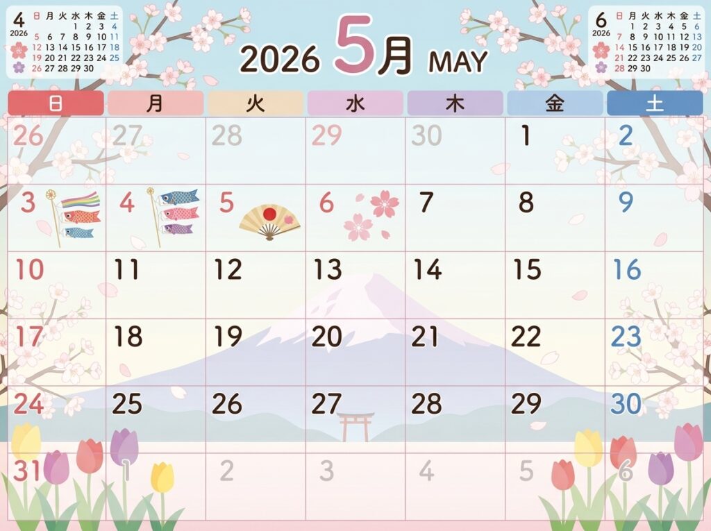 - 2026年GWは5連休(5月2〜6日)が確定。4月30日・5月1日を有給にすれば8連休も