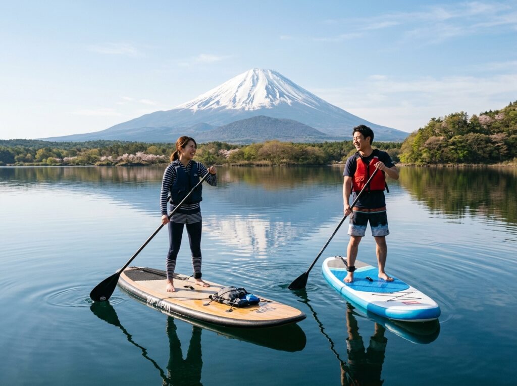 穏やかな山中湖はSUP(スタンドアップパドルボード)やカヤックに最適。富士山を見ながら湖面をゆく体験は、山中湖ならではの醍醐味です。初心者向けの体験プランも多く、事前予約がおすすめ(GW期間中は特に混雑します)。