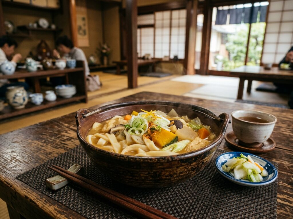 山梨グルメを味わうなら:山梨名物の「ほうとう」(太麺と野菜をみそ仕立てで煮込む郷土料理)は山中湖周辺でも複数の専門店が営業しています。