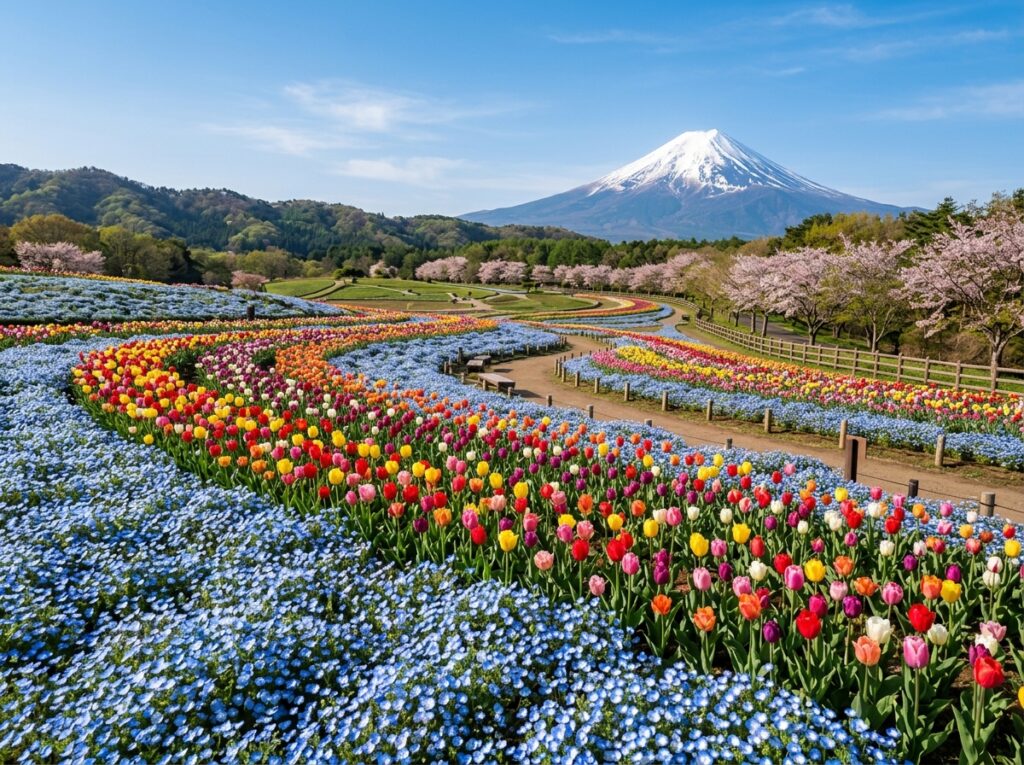チューリップとネモフィラが富士山をバックに広がる、GW屈指の絶景スポット。約30万平方メートルの敷地に季節の花々が咲き誇ります。無料エリアだけでも十分楽しめますが、有料エリア「清流の里」には滝や水車も点在し、見応えがあります。